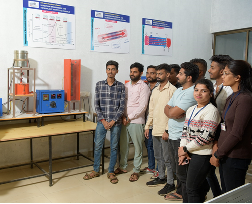The Thermal Engineering Lab in an engineering college is designed to provide students with practical knowledge of heat transfer, thermodynamics, and energy conversion systems. The lab includes equipment such as IC engines, calorimeters, heat exchangers, and refrigeration and air-conditioning test rigs. Students conduct experiments to study engine performance, measure thermal efficiency, and analyze heat transfer through conduction, convection, and radiation. This hands-on experience strengthens theoretical understanding and prepares students for real-world applications in power plants, automotive engineering, and thermal system design.