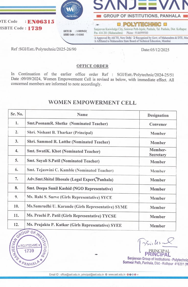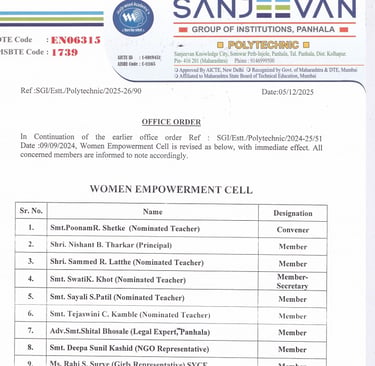 The Women Empowerment Cell (WEC) of the institution is established to promote the overall development, empowerment, and well-being of women students and staff. The cell works towards creating a safe, supportive, and inclusive environment that encourages gender equality and respect.