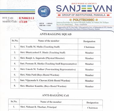 The committee is committed to preventing ragging in all its forms and takes strict action against any student found involved in ragging activities. The institution follows a zero-tolerance policy towards ragging.