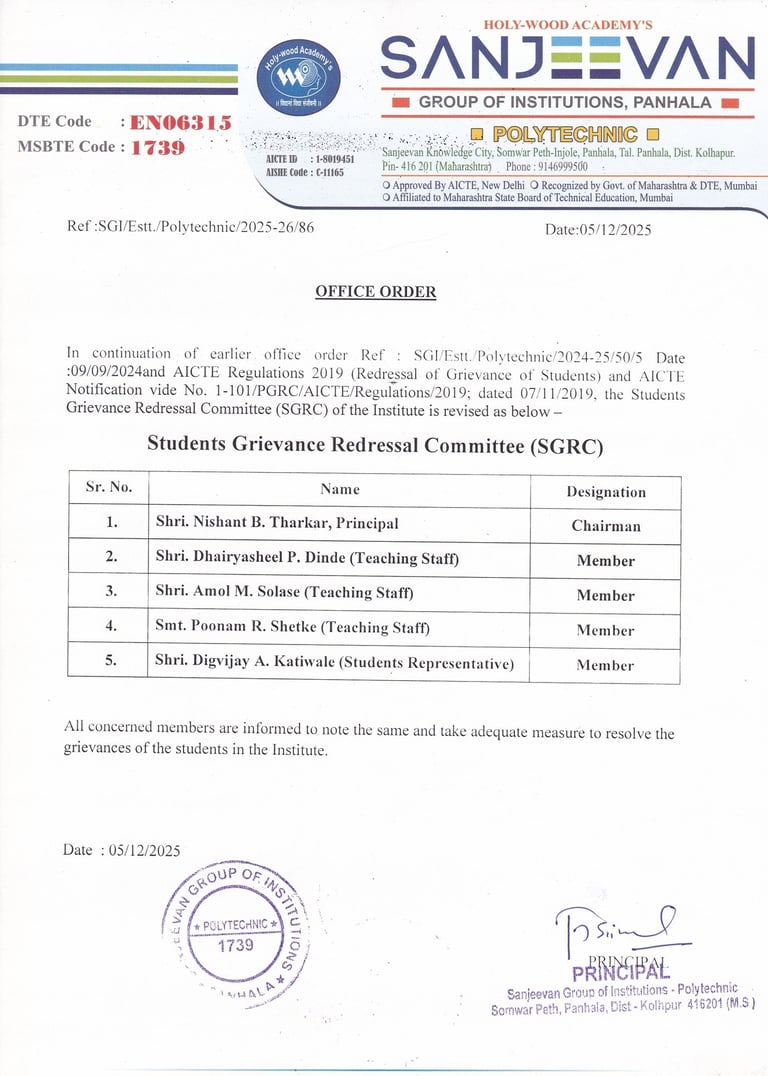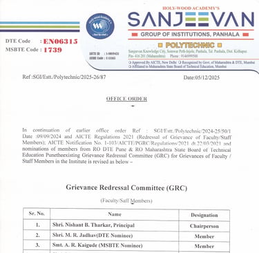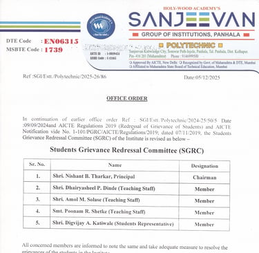 The Student Grievance Redressal Committee is established to address and resolve grievances of students in a fair, transparent, and time-bound manner. The committee ensures that student concerns related to academic, administrative, and personal issues are handled with confidentiality and impartiality.