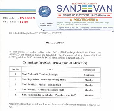 The SC / ST Committee of the institution is constituted to safeguard the interests of students and staff belonging to Scheduled Castes (SC) and Scheduled Tribes (ST). The committee ensures that no discrimination takes place on the basis of caste and that a supportive, inclusive, and respectful academic environment is maintained.