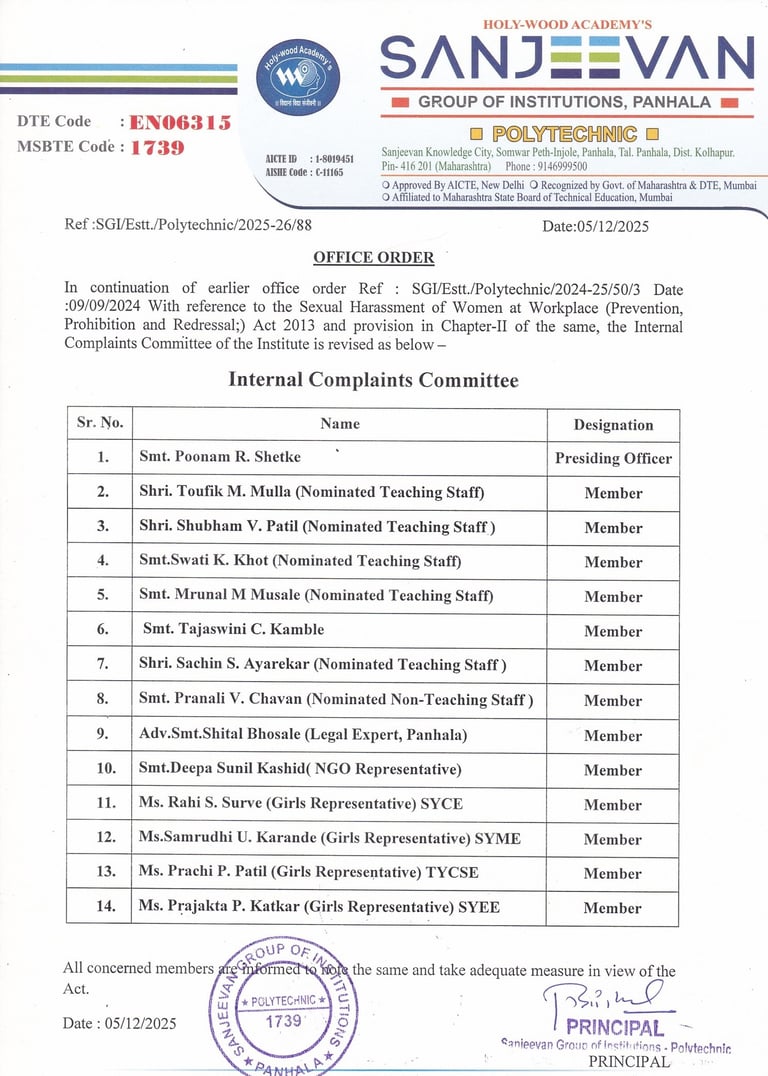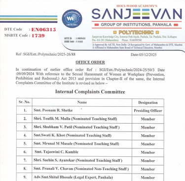 The Internal Complaints Committee (ICC) is constituted by the institution in accordance with the Sexual Harassment of Women at Workplace (Prevention, Prohibition and Redressal) Act, 2013. The committee is responsible for providing a safe, secure, and dignified environment for women students, teaching staff, and non-teaching staff within the campus.