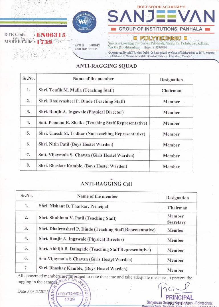 The Anti-Ragging Committee of the institution is constituted in accordance with the guidelines of the University Grants Commission (UGC) and AICTE to ensure a ragging-free, safe, and healthy campus environment.
