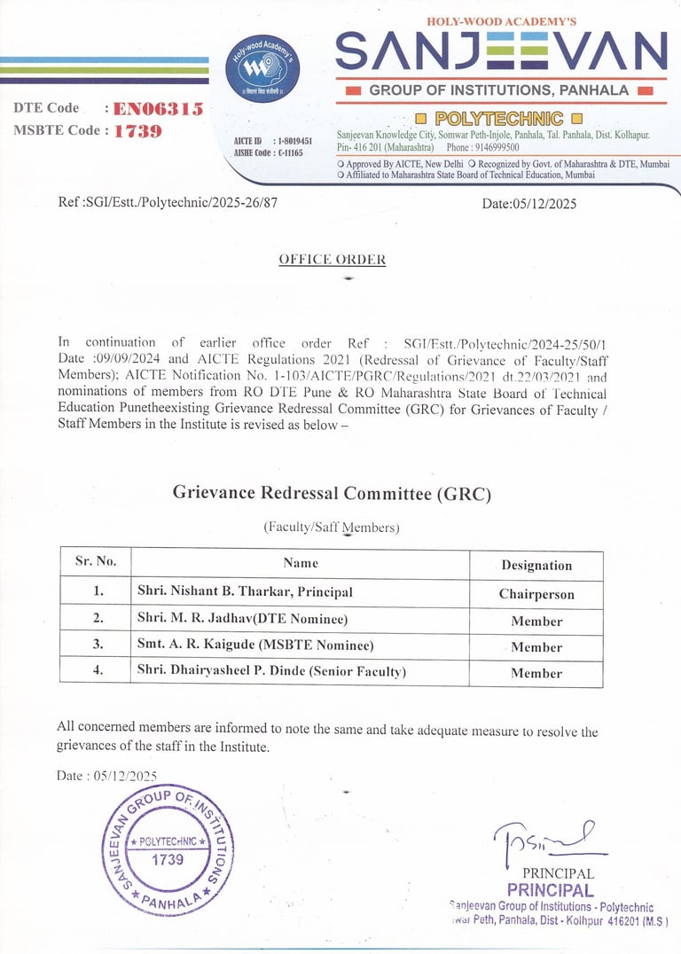 The Grievance Redressal Committee (GRC) is constituted to address and resolve grievances of students in a fair, transparent, and time-bound manner. The committee ensures that students’ concerns related to academic, administrative, and personal issues are heard and resolved without any discrimination.